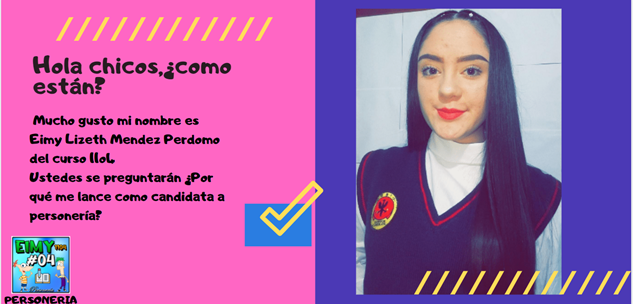 Bueno, empezando por que llevo bastante tiempo en la institución y siempre me ha interesado contribuir en el cambio y desarrollo del colegio Rodrigo Lara Bonilla, muchos de mis compañeros a lo largo de mi trayecto en la institución , me han considerado una gran líder con muchas cualidades y actitudes que podrían ayudar al cambio que muchos esperamos en la institución por esto y mucho mas me he lanzado a la personería del colegio Rodrigo Lara Bonilla espero y voten por mi.